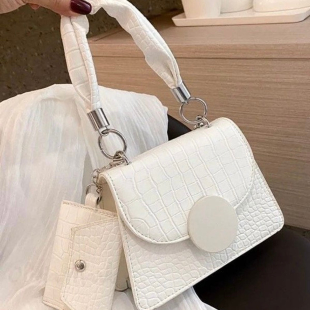 Con textura símil croco y diseño compacto, este bolso combina modernidad y estilo. Su detalle de círculo frontal y asa acolchada le aportan un aire único y sofisticado. Incluye monedero a juego y correa regulable para mayor practicidad. Disponible en blanco y negro, dos tonos versátiles que combinan con todo.