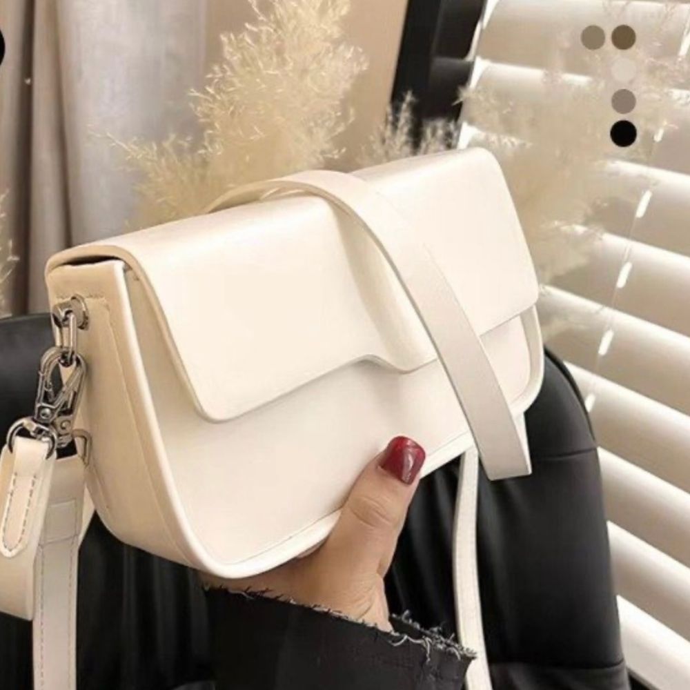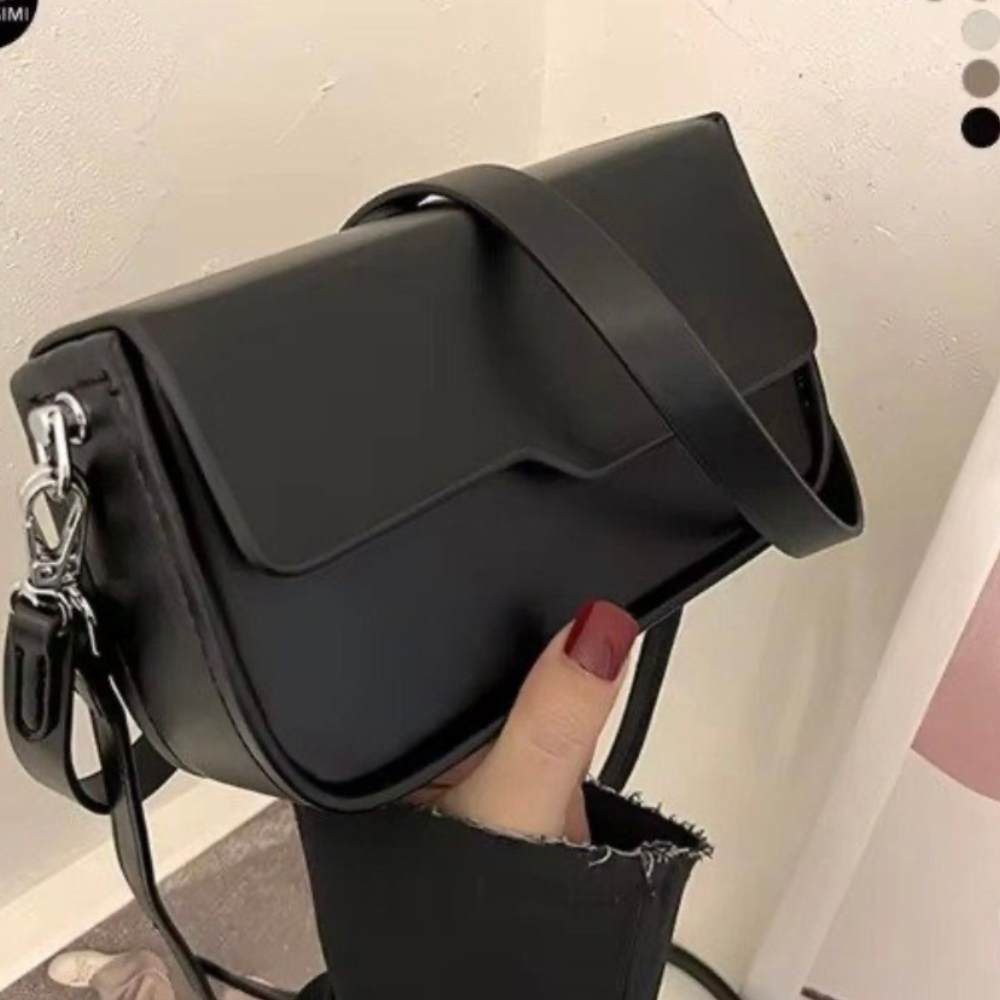 Cora – Un bolso bandolera minimalista con solapa estructurada y correa larga regulable. Su diseño liso y elegante lo convierte en un básico versátil para cualquier ocasión. Disponible en negro y blanco.