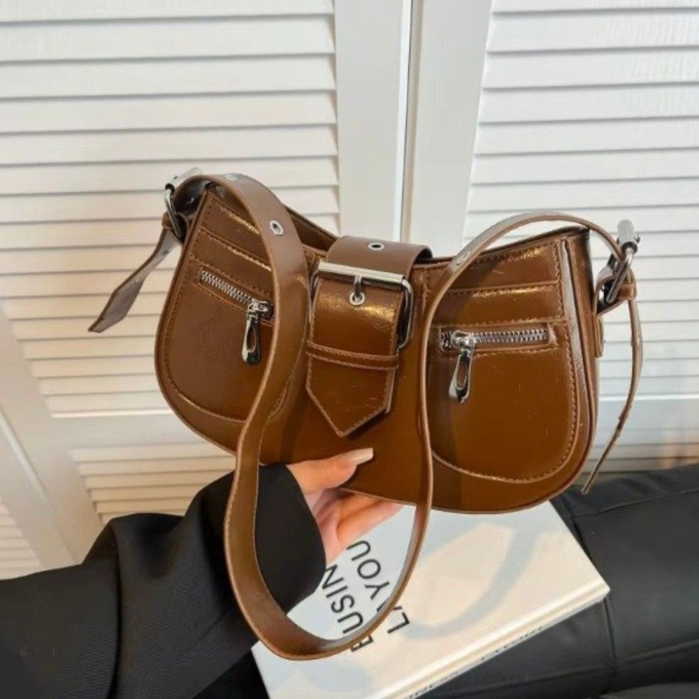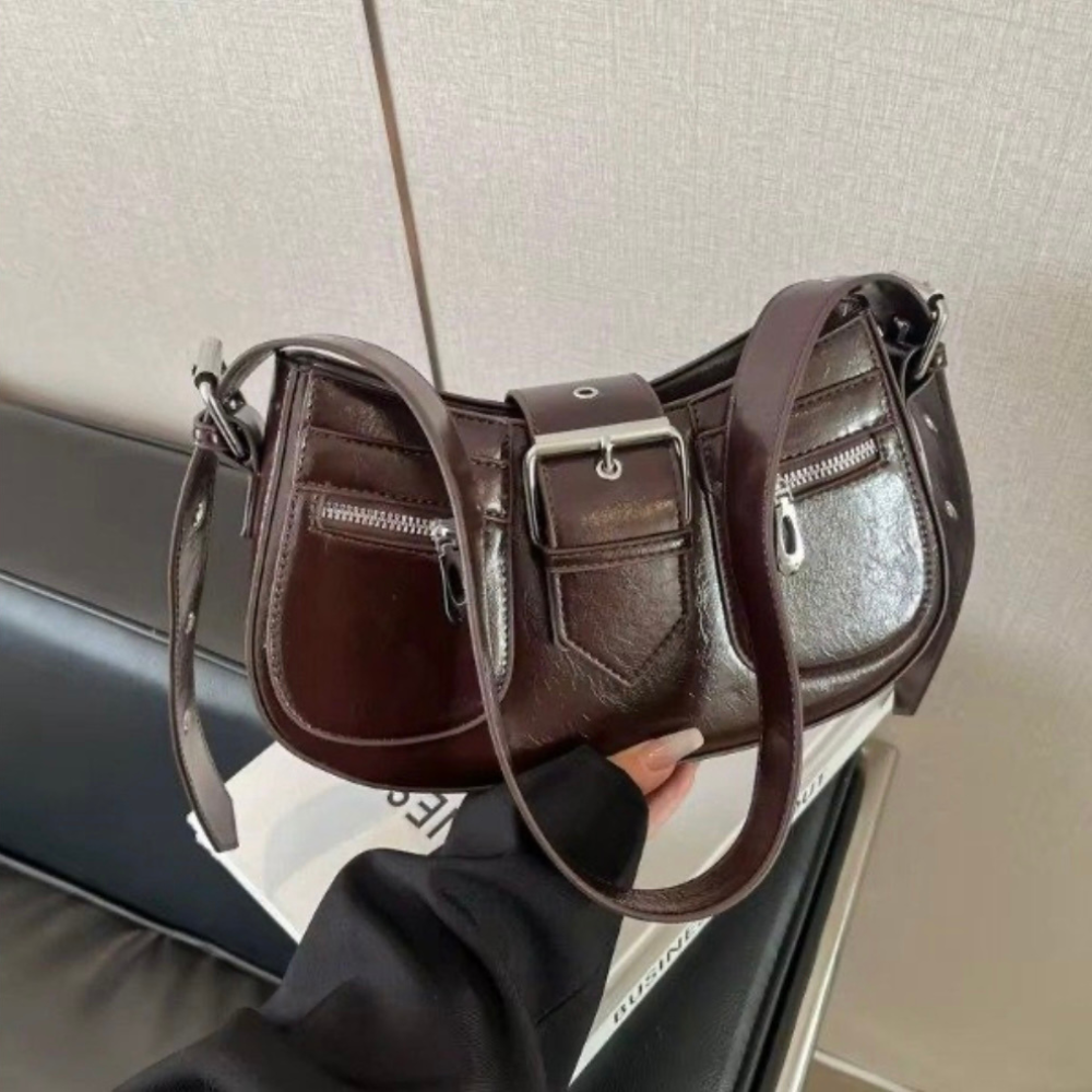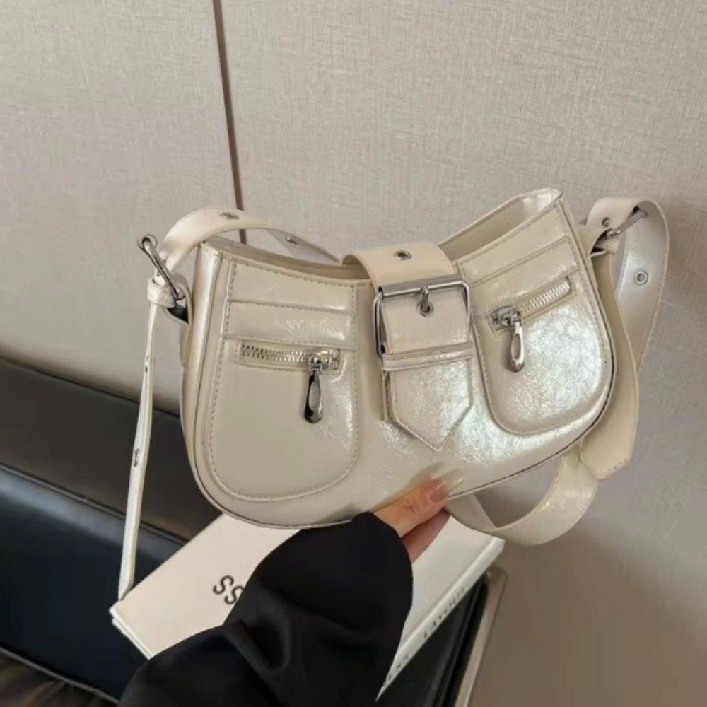 Elegante y funcional, con acabado brillante y varios compartimentos con cierre metálico para máxima organización. Su correa ajustable permite usarla al hombro o cruzada. Disponible en cherry, negro, blanco, chocolate y café.