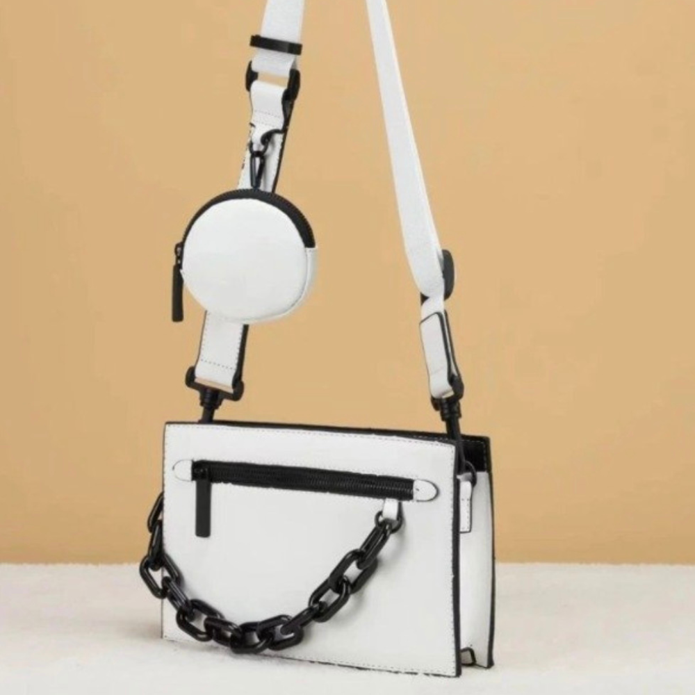 Bolso bandolera de diseño moderno con correa ajustable y bolsillo adicional tipo monedero. Detalles de cadena XL que aportan un estilo urbano y sofisticado. Disponible en blanco y negro, ideal para realzar cualquier look con personalidad.