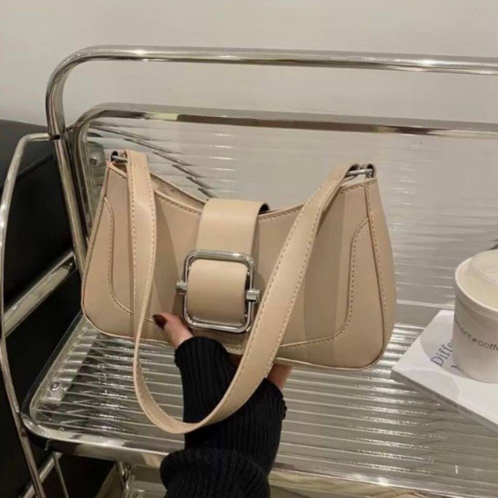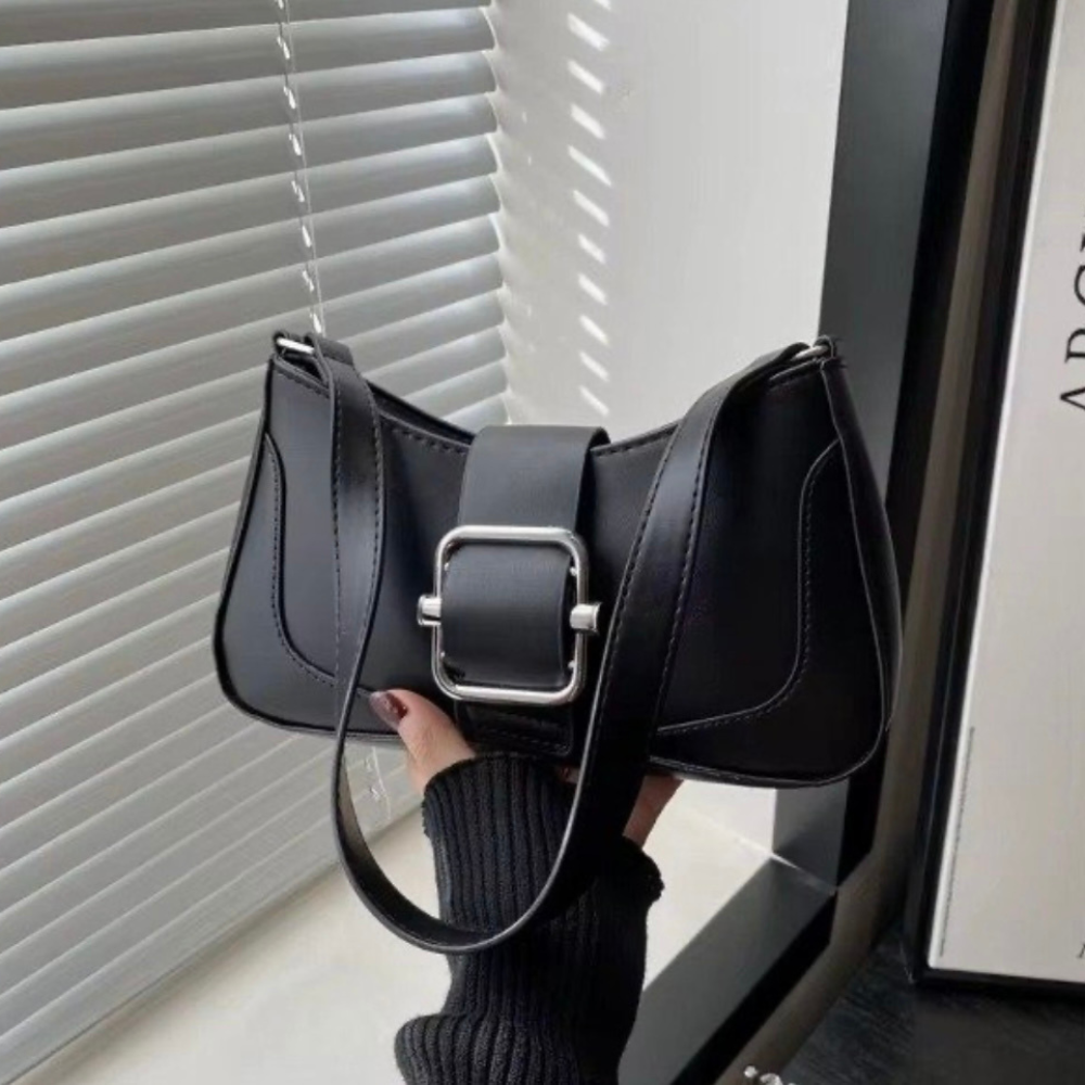 Un diseño moderno y estructurado que destaca por su hebilla metálica XL al frente, aportando carácter y sofisticación. Compacto pero funcional, es ideal para elevar cualquier look, desde lo casual hasta lo elegante. Disponible en negro y beige, dos tonos clásicos que combinan con todo.